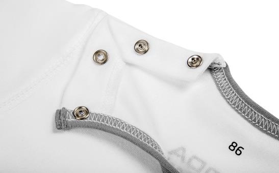 Body Škoda Motorsport blanche taille 68 avec détails gris et voiture de sport dessinée sur le devant. Composition : 100% coton biologique.