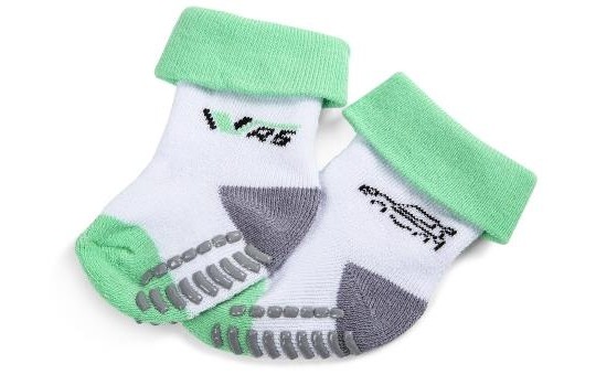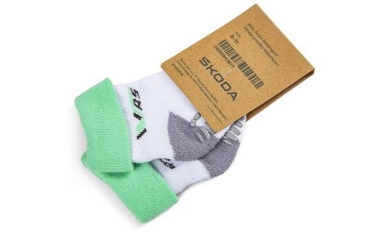 Chaussettes Škoda Motorsport pour bébés taille 12-14 avec bord vert électrique, logo VRS représenté et petit dessin d'une voiture sur le côté. Sur le dessous de la chaussette, un traitement antidérapant a été appliqué, inspiré du design d'un pneu. Composition : 80% coton, 15% polyamide, 5% élasthanne.