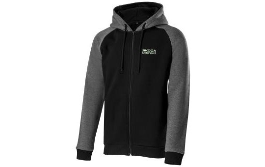 Sweat à capuche homme noir et gris Motorsport taille L. Le sweat a deux poches, une fermeture éclair et une capuche. Il convient pour les activités de plein air.