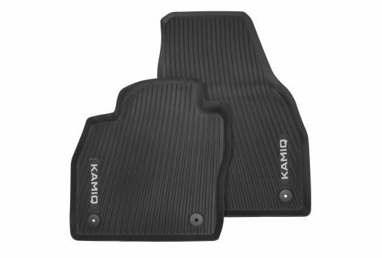 Les tapis de sol tous temps à bords relevés sont adaptés aux dimensions exactes du plancher avant de la Škoda Kamiq. Ils remplissent parfaitement l'espace sous les pieds et, grâce aux protubérances qui s'enclenchent sur les montants du plancher, restent fermement en place. Ils ont une surface antidérapante, recueillent la saleté et l'humidité des chaussures et sont très faciles à nettoyer. Ils s'enlèvent facilement à tout moment et se lavent simplement avec des détergents courants.