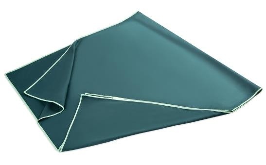 Serviette de bain en microfibre de couleur vert émeraude. La serviette est cousue avec un fil vert électrique contrasté. L’élastique cousu avec le logo ŠKODA permet d’accrocher la serviette ou bien de la garder pliée.