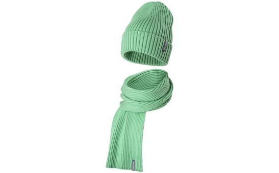 Ensemble bonnet et écharpe verts tricotés. La longueur de l'écharpe est de 165 x 25 cm.