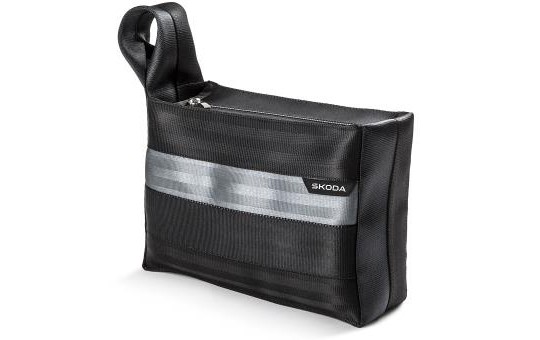 Sac à cosmétiques fabriqué à la main à partir de ceintures de voiture recyclées. Il peut être utilisé pour contenir une large sélection de produits qu'il s'agisse de cosmétiques ou d'autres éléments. Le matériau du sac est durable, solide et lavable. Il est équipé d'une boucle sur le côté (pour l'accrocher ou bien le tenir) et d'une fermeture éclair sur le dessus.