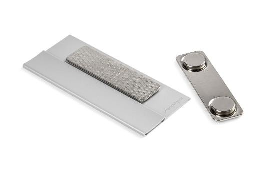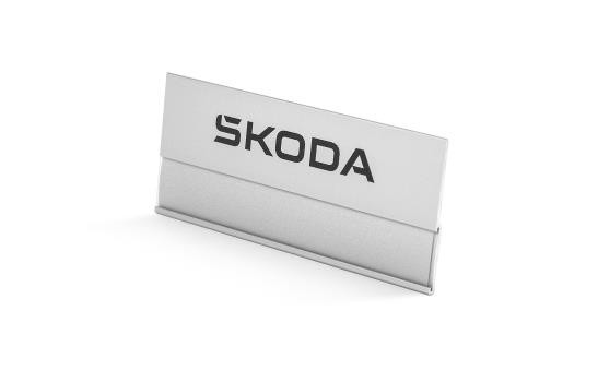 Badge nominatif magnétique. Logo Škoda imprimé de couleur noire sur la face avant. À l’arrière du corps du badge nominatif se trouve un clip magnétique. On a donc deux parties (badge nominatif + support de clip magnétique) démontables. Pour mettre le badge, il suffit de placer le support de clip magnétique sous son vêtement et de superposer par-dessus son vêtement le badge. Sur la face avant, sous le logo se trouve un espace permettant de glisser une étiquette en papier (non incluse dans l’emballage) protégée par une protection transparente.