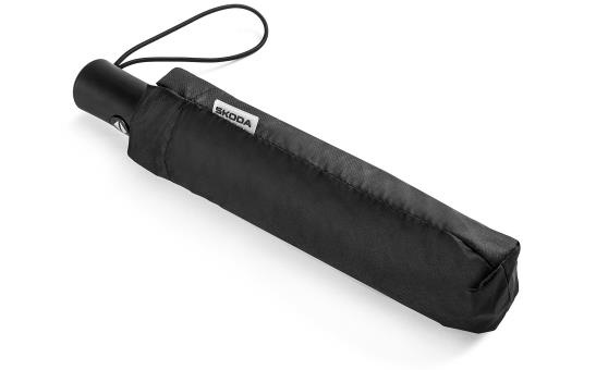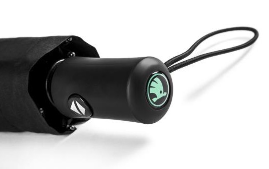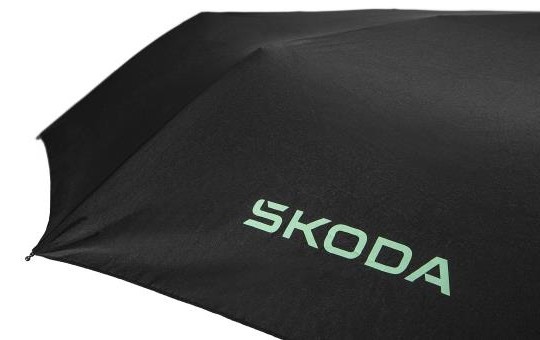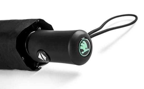 Parapluie pliable noir avec une impression Škoda aquaprint (visible seulement après avoir été mouillée) et une impression Škoda vert électrique