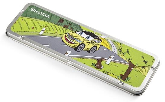 Ensemble de 6 crayons dans une boîte en métal avec un motif pour enfants. Chaque crayon a un imprimé ŠKODA noir. Ce produit convient aux enfants à partir de 3 ans.