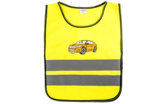 Gilet réfléchissant jaune pour enfant avec motif de la voiture Enyaq sous forme de jouet. Bandes élastiques sur les côtés et bandes argentées réfléchissantes sur le devant et l'arrière du gilet. Tailles de gilet : S, M. Le produit répond à la norme EN 1150.