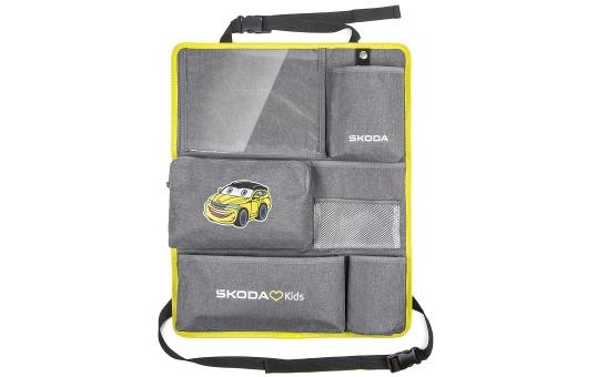 Organisateur de siège auto de dimensions 44 x 54 cm avec sept poches de couleur grise avec des détails jaunes. Des motifs de voiture pour enfants et ŠKODA LOVE KIDS sont représentés sur les poches de l’organisateur. De plus une poche pour les vêtements est dédiée à l’arrière. Des sangles permettant la fixation au siège de couleur noire sont présentes.