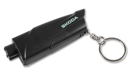 Porte-clés qui sert en plus de sa fonction initiale d’un outil d’évacuation d’urgence compact et puissant en cas d’accident. Logo imprimé ŠKODA en couleur électrique. Le porte-clés a deux fonctions : un cutter recouvert d’un clip de protection pour couper les ceintures de sécurité coincées et un brise vitre pour briser les vitres latérales de la voiture. Le brise vitre est activée en appuyant sa tête de ressort contre la vitre de la voiture. Appuyez jusqu’à ce qu’il s’enclenche.