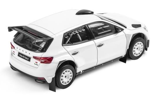 Modèle miniature avec une échelle 1:43 de la Škoda Fabia RS Rally2 en blanc.