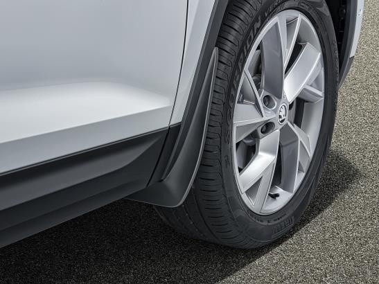 Les bavettes avant sont un autre des accessoires pratiques de la gamme d'accessoires d'origine ŠKODA qui augmentent l'utilité du véhicule. Elles protègent les parties inférieures de la carrosserie de la saleté et des dommages causés par les pierres et les débris qui les heurtent. Les bavettes sont particulièrement utiles en hiver, lorsque le sel corrosif répandu sur les routes adhère généralement aux bavettes plutôt qu'à la carrosserie du véhicule. Leur géométrie est parfaitement adaptée à celle des passages de roue afin d'éviter toute perte aérodynamique. Les bavettes sont fabriquées à partir d'un matériau plastique de haute qualité qui conserve sa forme entre -50 °C et +50 °C. Elles sont résistantes aux produits chimiques (sel de déneigement, huile et carburant) et aux rayons UV. Et comme elles se fixent facilement sur les passages de roue, il n'est pas nécessaire de modifier la carrosserie, ce qui signifie que la protection contre la corrosion reste intacte.