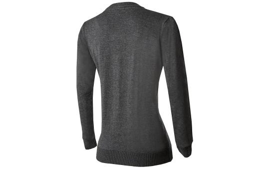 Pull femme Škoda gris. Logo situé sur une étiquette tissée sur le bord inférieur du pull. Encolure en V.