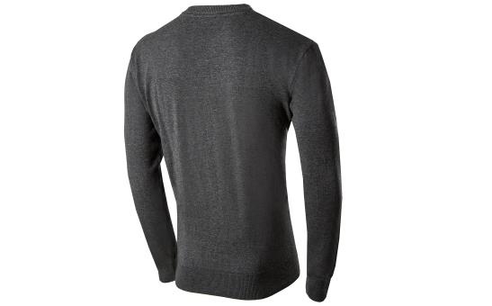 Pull homme Škoda gris. Logo situé sur une étiquette tissée sur le bord inférieur du pull. Encolure en V.